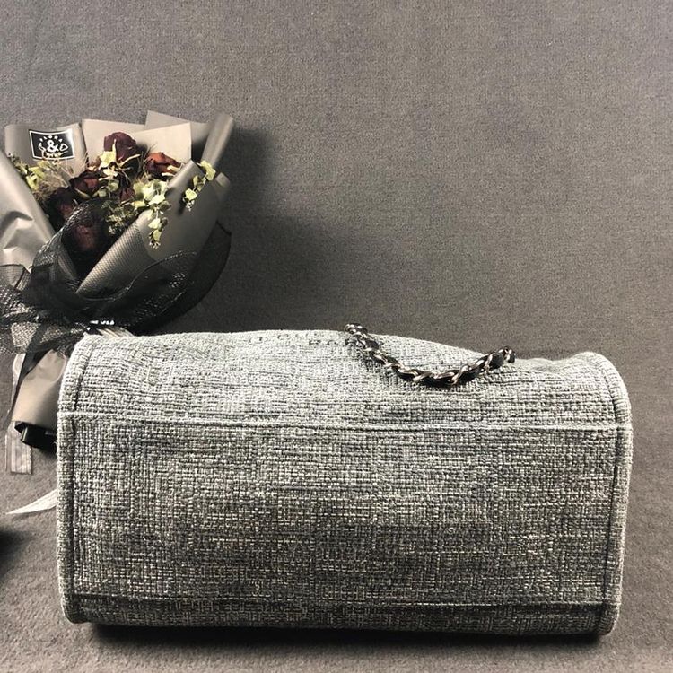シルバートーンハードウェア付きチャネルツイードキャンバスのシャネルラージドーヴィルキャンバストート。